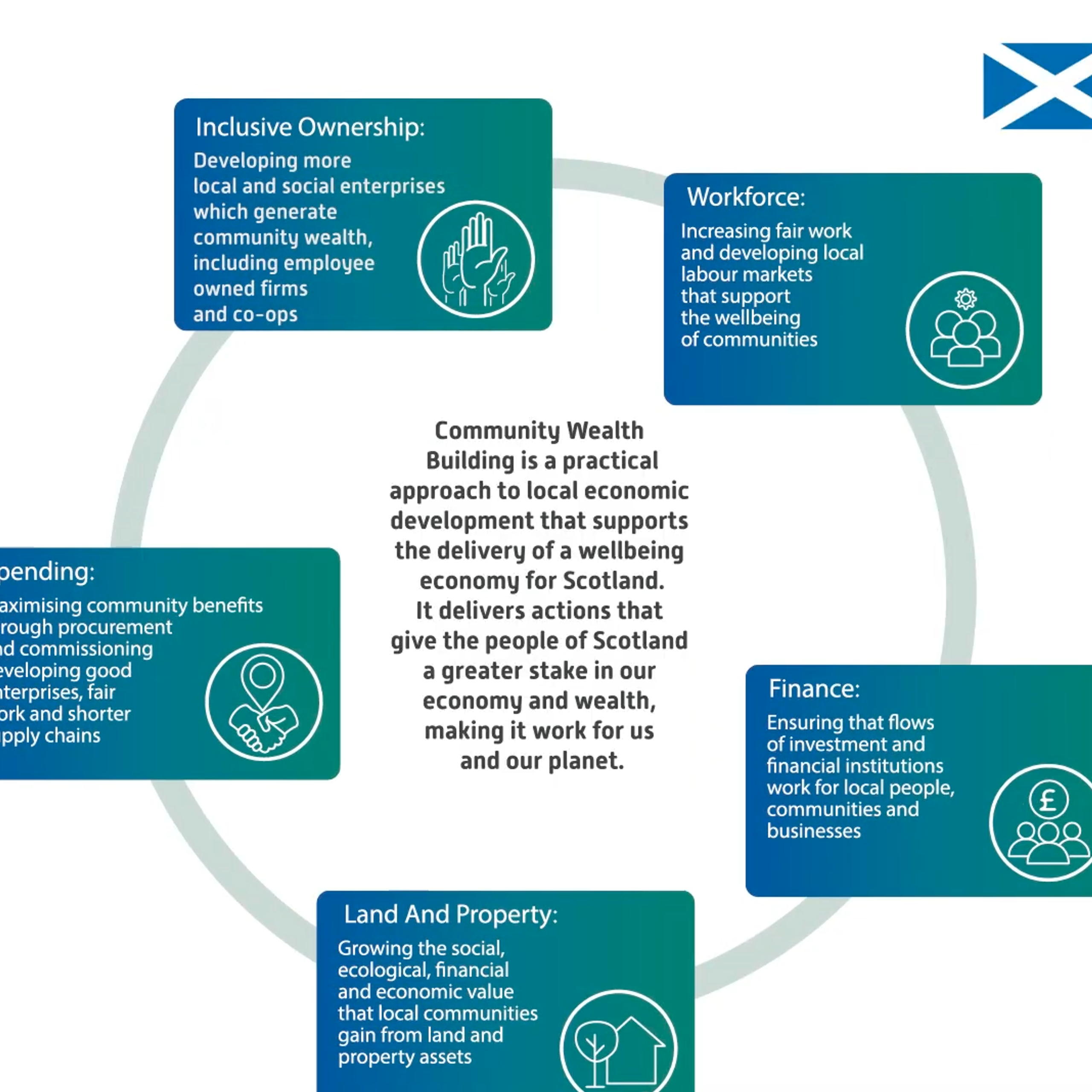 - Spending: Maximising community benefits through procurement and commissioning, developing good enterprise, fair work and shorter supply chains.